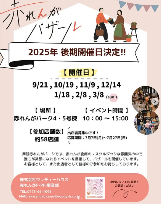| お問い合わせ | (株)ウッディーハウス赤レンガP-PFI事業部 0773661096 akarengabazaar@woody-h.co.jp |