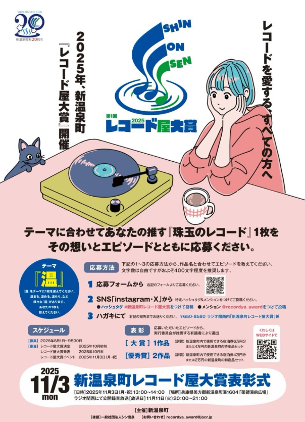 | お問い合わせ | 新温泉町レコード屋大賞表彰式 [日時]2025年11月3日(月・祝)13:00~14:00 [場所]兵庫県美方郡新温泉町湯1604 「薬師湯前広場」 ラジオ関西にて公開録音放送 [放送日]11月11日(火)20:00~21:00 [主催]新温泉町 [後援]一般社団法人シン音泉 [お問い合わせ] recordya_award@jocr.jp |
