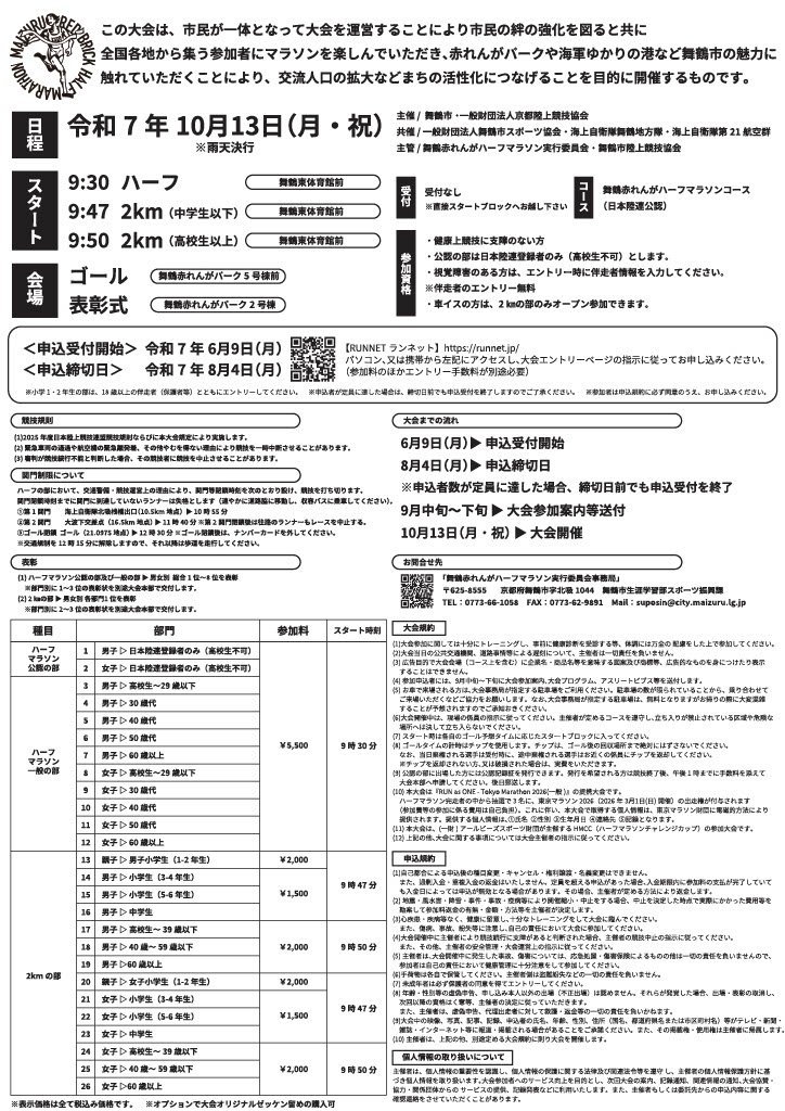 | お問い合わせ | 舞鶴赤れんがハーフマラソン実行委員会事務局 TEL 0773-66-1058 |