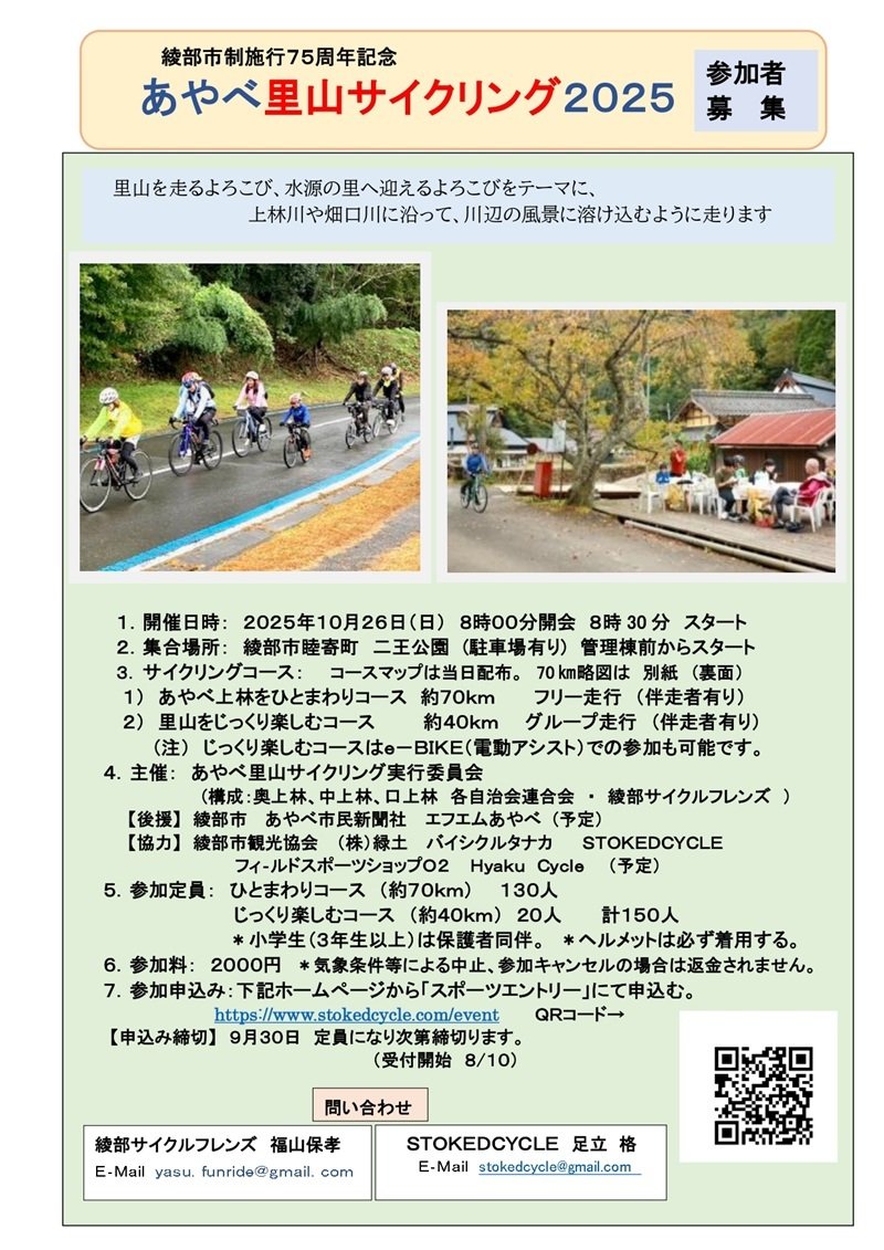 | お問い合わせ | あやべ里山サイクリング 実行委員会 綾部サイクルフレンズ 福山保孝 E-mail:yasu.funride@gmail.com STOKEDCYCLE 足立 格 E-mail:stokedcycle@gmail.com |