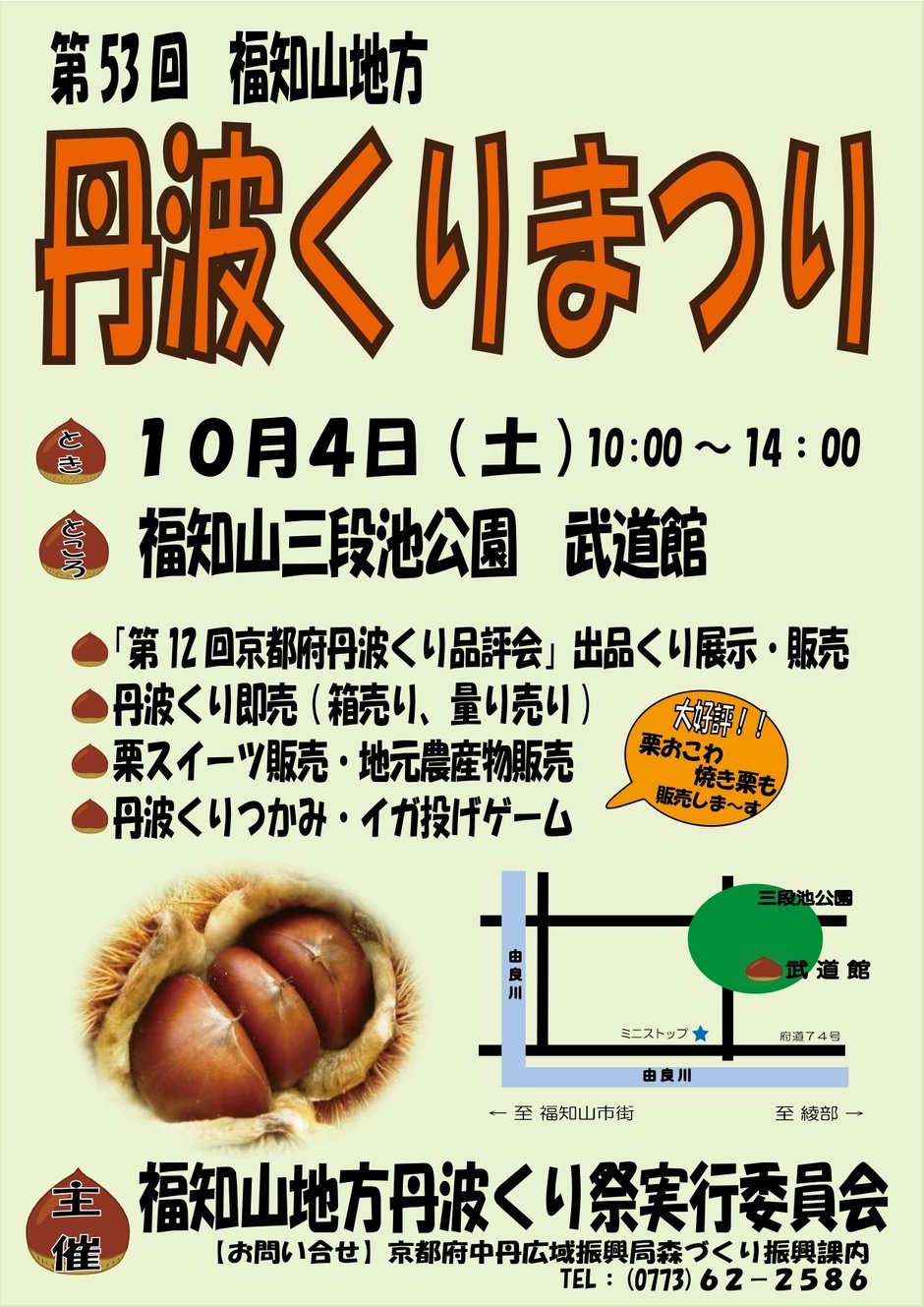 | お問い合わせ | 福知山地方丹波くり祭実行委員会 ( 事務局:京都府中丹広域振興局森づくり振興課内 Tel0773-62-2586・Fax0773-62-2859) |