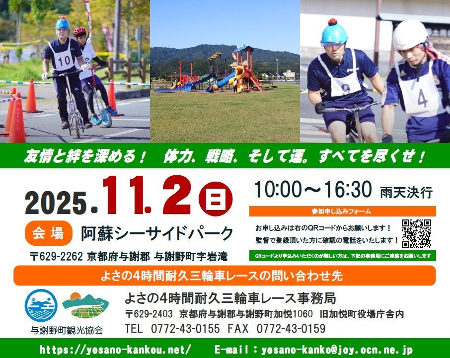 | お問い合わせ | よさの4時間耐久三輪車レース事務局 TEL 0772-43-0155 |