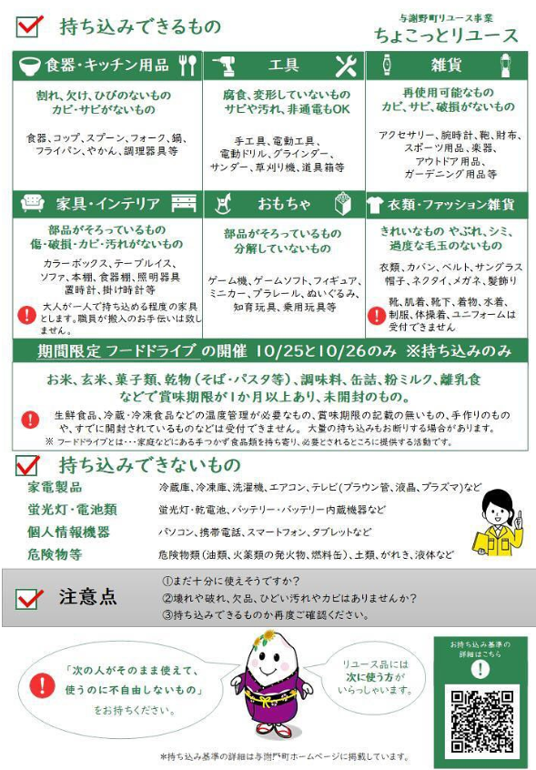 | 時間 | 🗓️日時 令和7年10月17日(金)~26日(日) 午前10時~午後3時 ※土曜日、日曜日も受け付けいたします ※10月26日(日)の最終日は、町内の方も「持ち帰りのみ」となります |