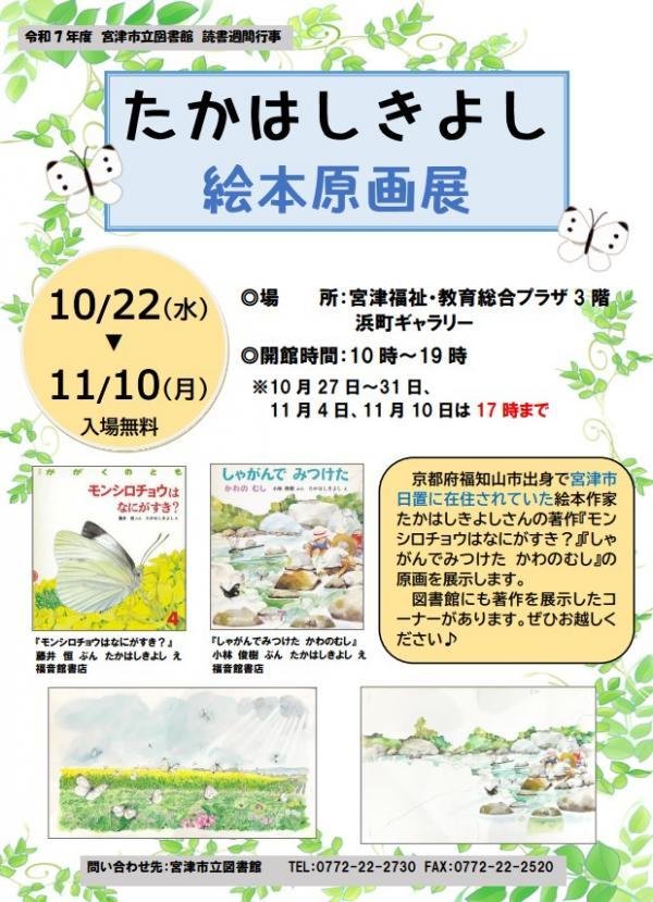 宮津市立図書館では、読書週間行事として「たかはしきよし 絵本原画展」を開催します。