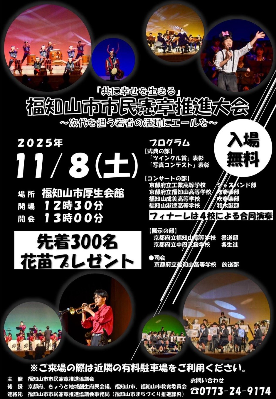 福知山市市民憲章推進協議会では、「次代を担う若者の活動にエールを」をテーマに、市内の学校にご協力いただき、福知山市市民憲章推進大会を下記のとおり開催します。