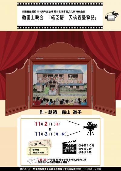 現在、開催中の企画展示「天橋義塾の教育と近代宮津の歩み」の関連事業として、宮津市民文化祭の開催に合わせて、市内在住の作家による天橋義塾を題材にした紙芝居の動画上映会を開催。
