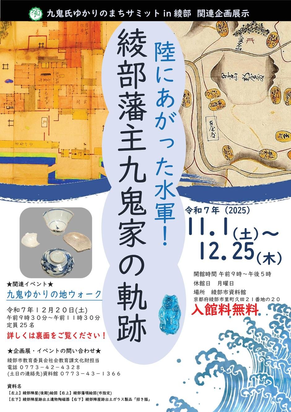 志摩国鳥羽(三重県)で水軍として活躍した九鬼家が、江戸時代に内陸部の綾部でどのような拠点を築き、暮らしたか展示解説とあわせ、綾部の街中(綾部陣屋跡や菩提寺である隆興寺など)を探索する1時間程度のフィールドワークを開催します。