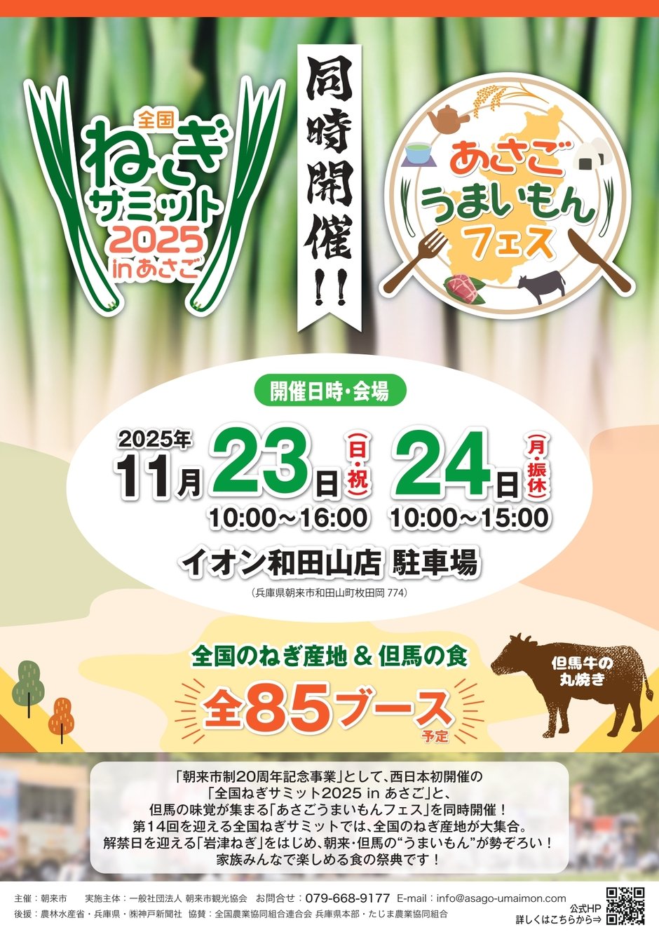 「ねぎ」という食材に注目し、全国のねぎ産地が一堂に会する西日本での初開催イベント『全国ねぎサミット2025in あさご』と、岩津ねぎなどの市特産品をはじめとする但馬ブランド産品が一堂に集まり、販売・飲食などを行う「食」をテーマとしたイベント『あさごうまいもんフェス』を同時開催します。