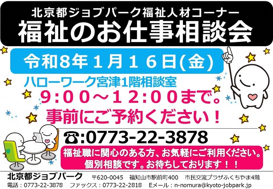 | お問い合わせ | 北京都ジョブパーク福祉人材コーナー 電話番号:0773-22-3878 FAX番号:0773-22-2818 |