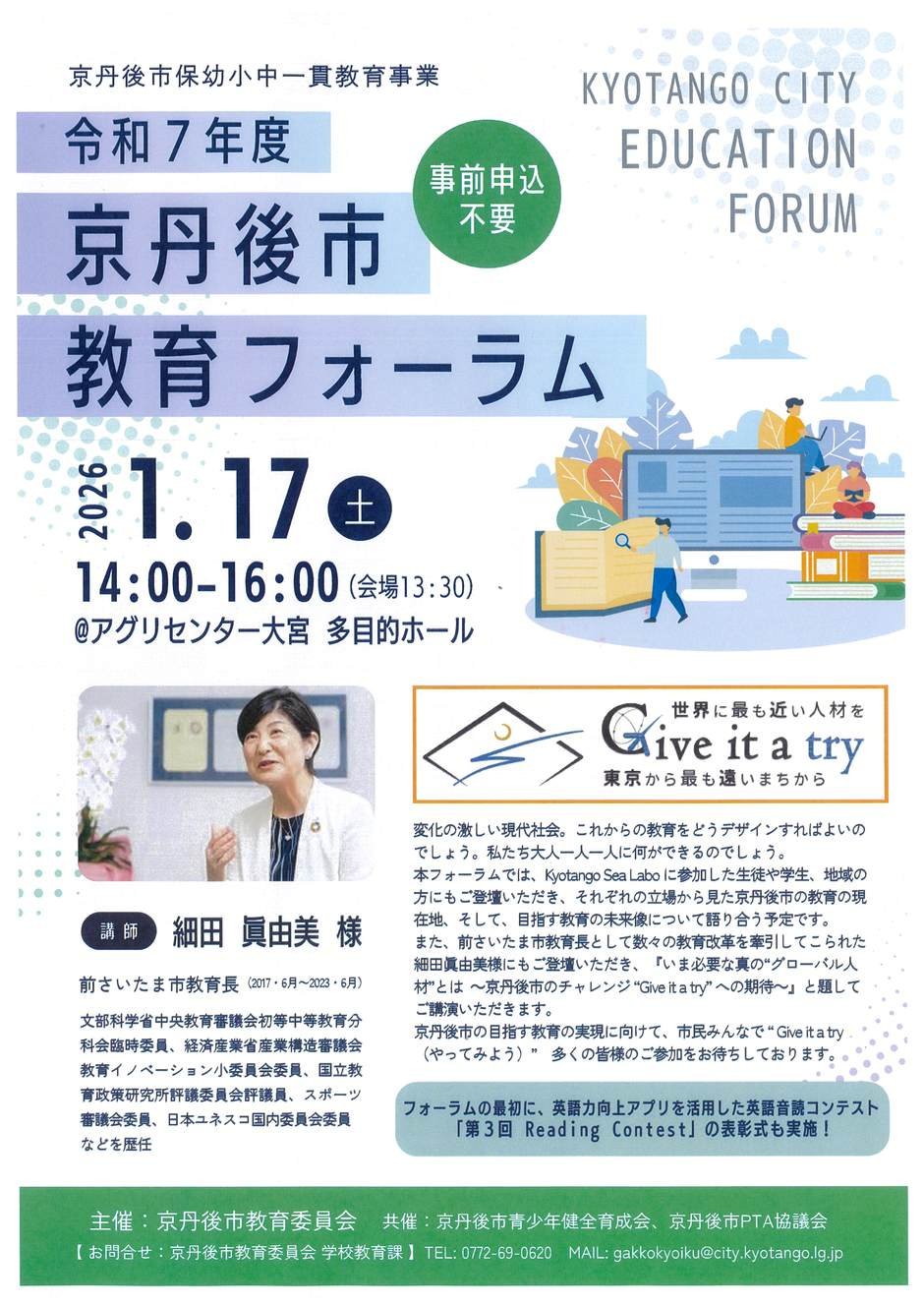 京丹後市では、令和2年度より、就学前から中学校卒業までの10年間にわたる「保幼小中一貫教育」の取組を進めています。保幼小中一貫教育の現在の取組状況や今後目指していく方向性等について、市民の方々と一緒に考え理解を深めていただく機会として教育フォーラムを開催します。