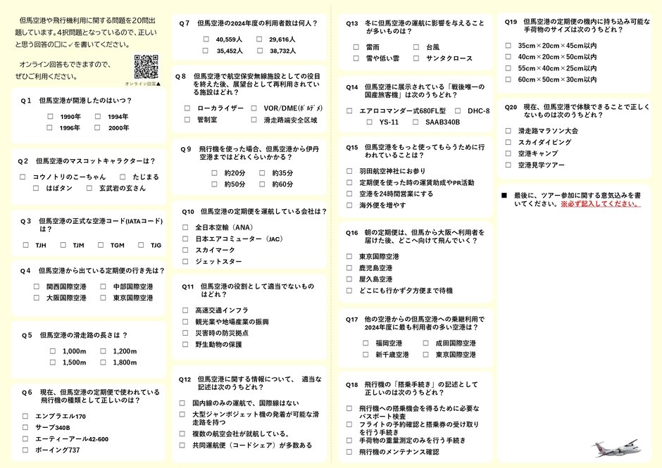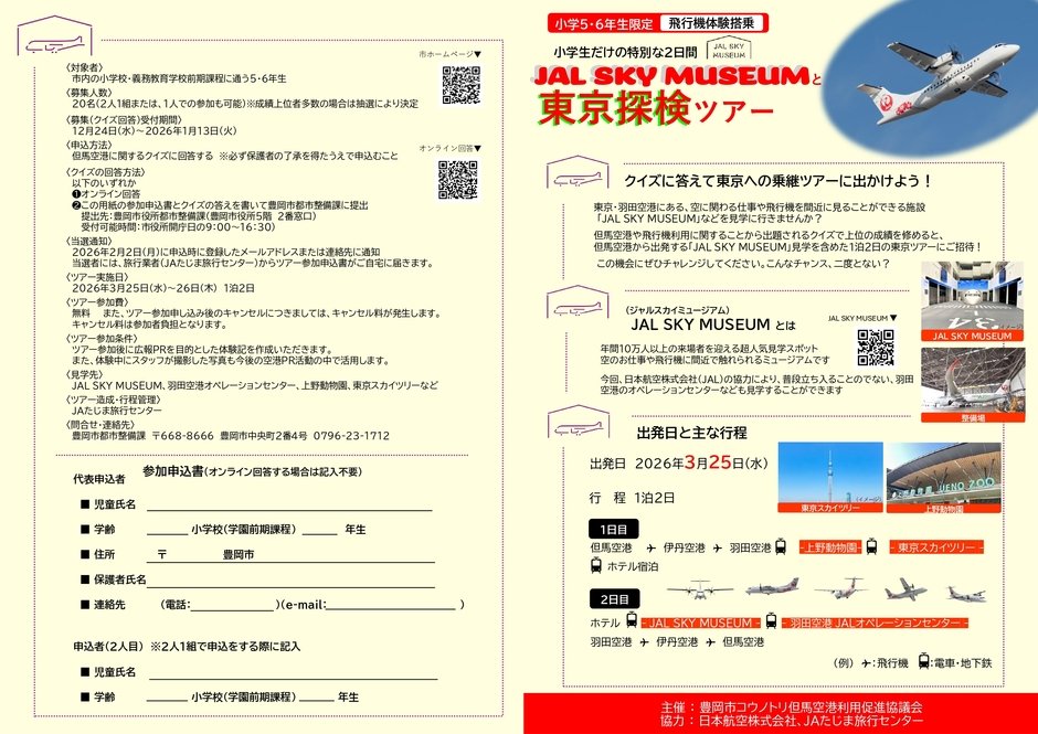 但馬空港や飛行機利用に関することから出題されるクイズで上位の成績を修めると、 但馬空港から出発する「JAL SKY MUSEUM」見学を含めた1泊2日の東京ツアーに招待します。