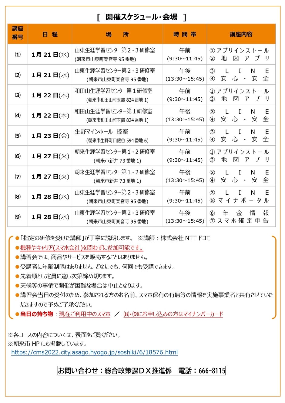 | お問い合わせ | 企画総務部総合政策課DX推進係 朝来市和田山町東谷213番地1 Tel:079-666-8115 Fax:079-672-4041(代) |