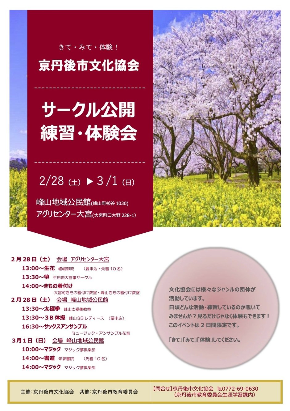 | お問い合わせ | 教育委員会事務局 生涯学習課 〒629-2501 京丹後市大宮町口大野226番地(大宮庁舎) 電話番号:0772-69-0630 ファックス:0772-68-9061 |