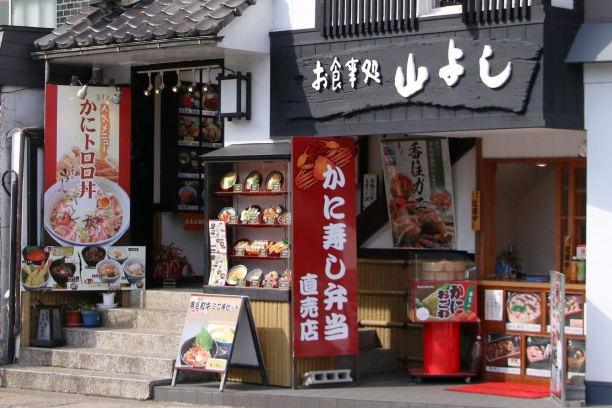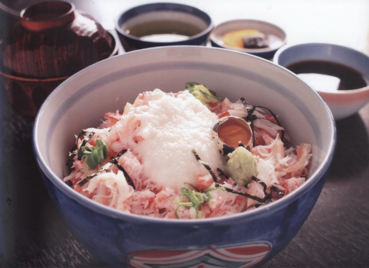 城崎駅のすぐ目の前にある水産会社が直営する食事処。香住ガニをふんだんにのせた「かにとろろ丼」は人気ナンバー1メニュー。
