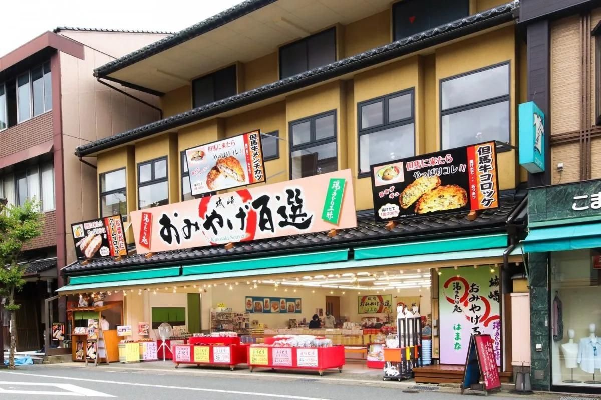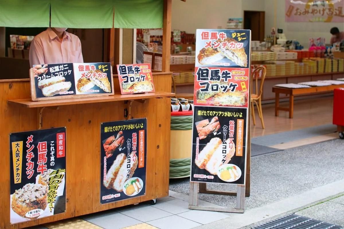 城崎温泉駅から徒歩1分。広い売り場と自社製造の食べ歩きコロッケも。
