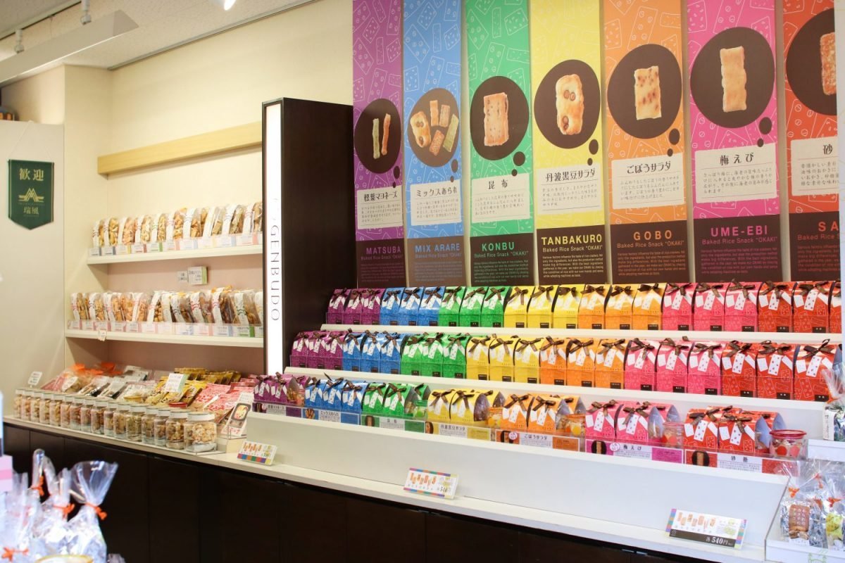 「おかきのげんぶ堂」のカラフルな店内には数え切れない種類のおかき・あられがあります。