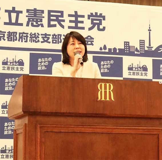 5月6日告示、5月11日投開票の精華町町議選の予定候補の大野翠さん、徳田貴仁さん、10月に予定されている長岡京市議選予定候補の宮小路康文さんのご挨拶もありました。府連を代表して福山哲郎 参議院議員の挨拶、新しく府連幹事長に就任の田中美貴子 京都府会議員の挨拶、泉ケンタ 衆議院議員、山井和則 衆議院議員の国会報告もありました。